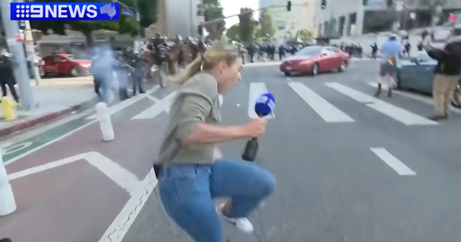 Officer turns and shoots Australian reporter covering Los Angeles immigration protests with rubber bullet on live TV.