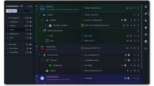 Today I can share a major development status update of XPipe, a connection hub that allows you to access your entire server infrastructure from your local desktop. It can make your life easier when working with any kind of servers by eliminating all the commonly tedious tasks that come up when interacting with remote systems, either from the terminal or from a graphical interface. XPipe comes with integrations for SSH, docker and other containers, various hypervisors, and more without requiring setup on your remote systems. You can also keep using your favourite text/code editors, terminals, password managers, shells, command-line tools, and more with it.