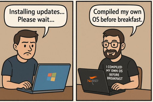 Oh did he compile his OS before breakfast? I think the screen needs to show the time as proof it was indeed breakfast. Perhaps the next panel can be the windows guy just in awe that an OS was compiled before breakfast.