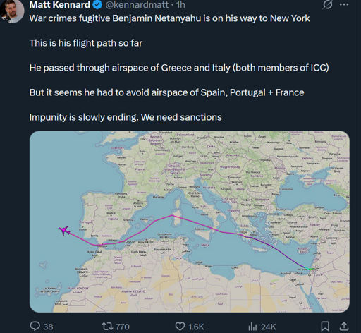 arrow-up174imageGreece and Italy violate ICC arrest warrant but France and Spain don't allow Netanyahu to pass through their airspace anymore.cm0002@lemmy.world to Europe@lemmy.dbzer0.com · 1 month agomessage-square37linkfedilink