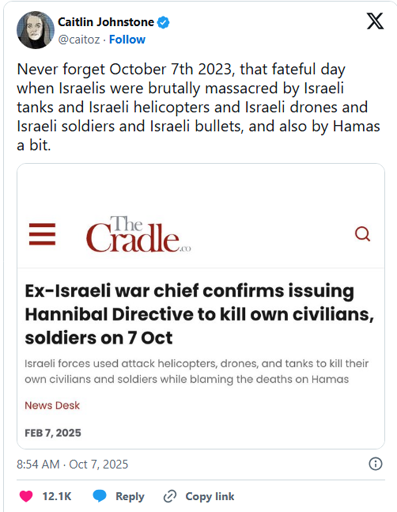 On Oct 7, the IOF was instructed to carry out the Hannibal Directive. No hostages should be taken by Hamas. So they did. IOF attack helicopter, tanks and drones were used to kill their own people, Israelis.