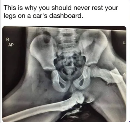 Don’t fucking kick your legs up in a car what the fuck you’re in a high speed vehicle that can crash at any moment resting legs near an air bag???