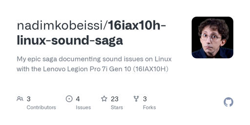 Sunshine (she/her)@lemmy.ca to Linux@programming.devEnglish · 9 days ago$830 Bug Bounty to Whoever Fixes the Lenovo Legion Pro 7 16IAX10H's Speakers on Linuxgithub.comexternal-linkmessage-square8linkfedilinkarrow-up1124