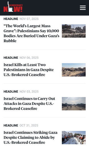ALT: Screenshots from https://www.democracynow.org/topics/gaza , showing reports of Israeli attacks on Gaza on 29, 30, 31 Oct, 3, 6, 7 Nov. Only for example.