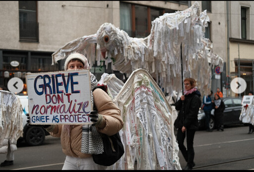 >> On the national day of grief, #Germany observes a day of silence and commemorates victims of war and oppression. The collective @grieving_doves called for a march of grief through Berlin to grieve Palestinian martyrs. The group meets weekly to write names of deceased Palestinians with their age on strips of fabric that they then sow onto wings. …