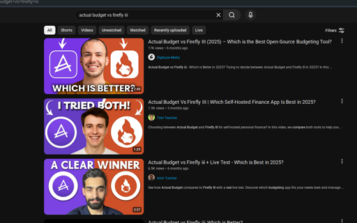 This is the first time I’ve had this much slop come up in one video. The search I used was “Actual budget vs Firefly III”: https://www.youtube.com/results?search_query=actual+budget+vs+firefly+iii. I mostly watch Linux tech related videos, some gaming stuff, DIY, bit of comedy here and there, philosophy and some socio-anarchist stuff (ya know, like protecting your privacy lol). No idea why I would get so much slop from one search other than the enshittification of YouTube is accelerating :/