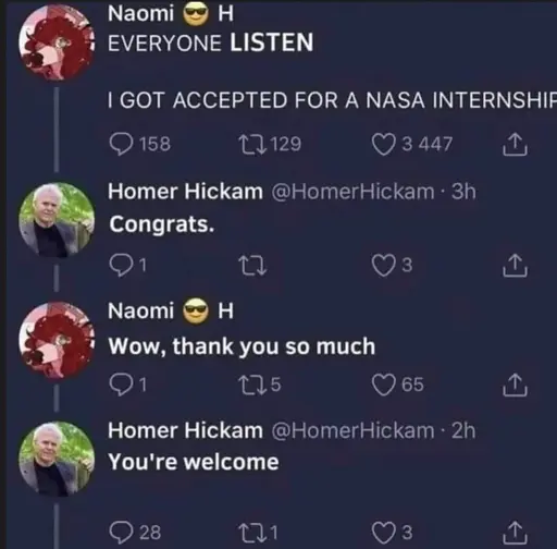 Before this happened, I actually knew who Homer Hickam was because I had read October Sky, made the whole tweet chain just that slight bit funnier.