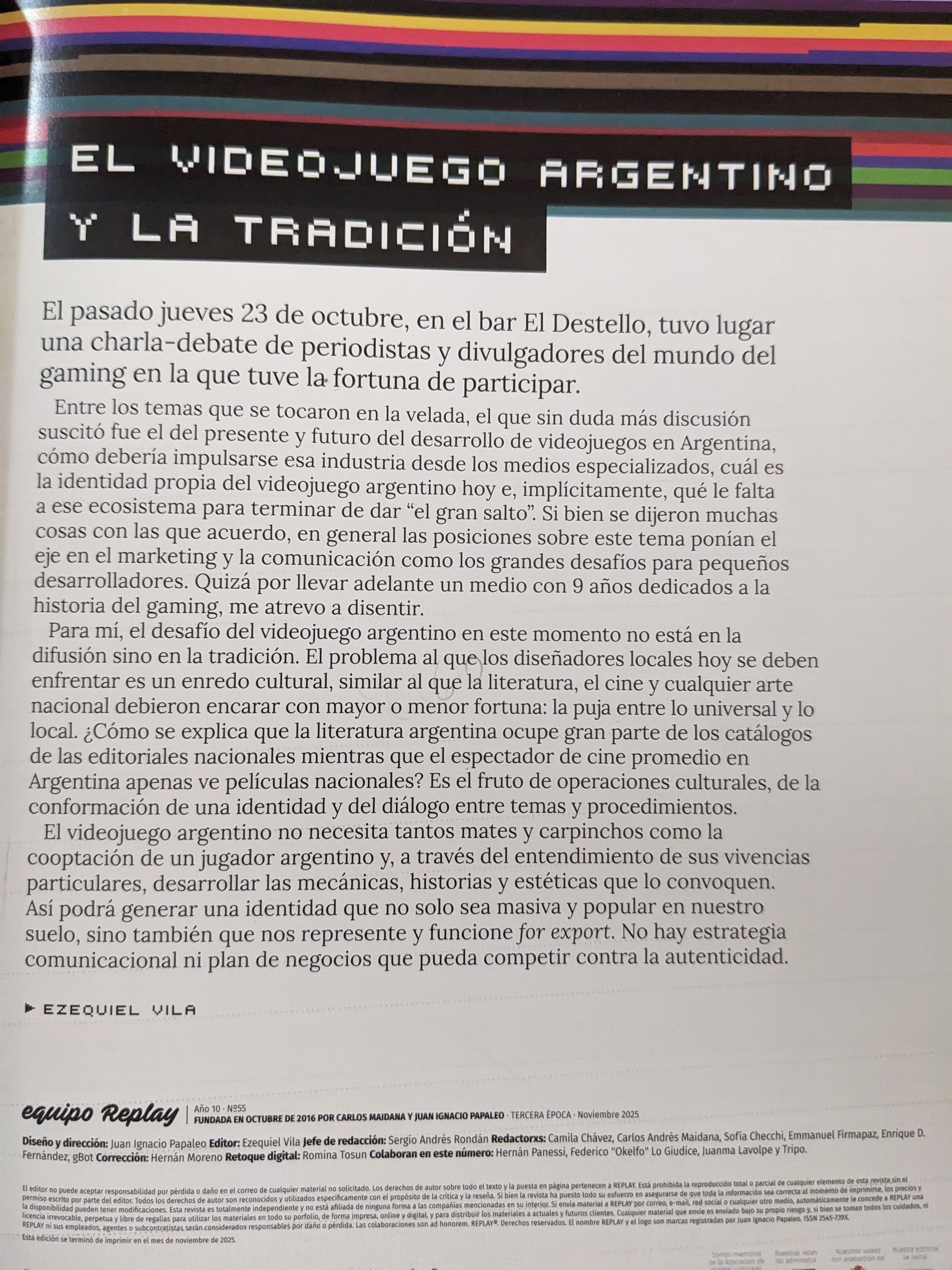 Revista Replay es una publicación gráfica bimestral con más de 55 números en circulación y 9 años de vida. Impresa en #argentina pero con llegada por correo a todo el mundo. Realizamos notas de investigación sobre el desarrollo de videojuegos e informática en Argentina y la región, y también entrevistamos a referentes de la industria a nivel internacional. ¡Suscribite en revistareplay.com.ar! Ahí también pueden descargar PDFs para leer.