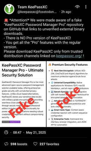 I’m not sure who they were trying to fool? Bluntly, if you’re keeping your passwords in a local repo using strong encryption via something like keepass, you’re generally not the kind of person to see “KeePassXE Pro ultra mega best edition” and blindly download it without vetting the source…