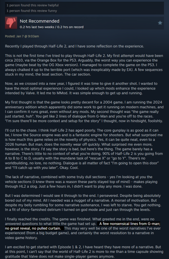 I have to agree with him, honestly. HL2 was novel for its time, but if you’re playing it for the first time in 2026 then yeah, it really doesn’t hold up to modern game experiences. I also dislike games that end ambiguously or on cliffhangers, and the lack of closure provided from sequel-bait endings like HL2’s can be annoying to people who just want to play a complete story. I want to see it through to the end and get the feeling that my actions had any sort of consequence to the world, and HL2 really doesn’t provide that.