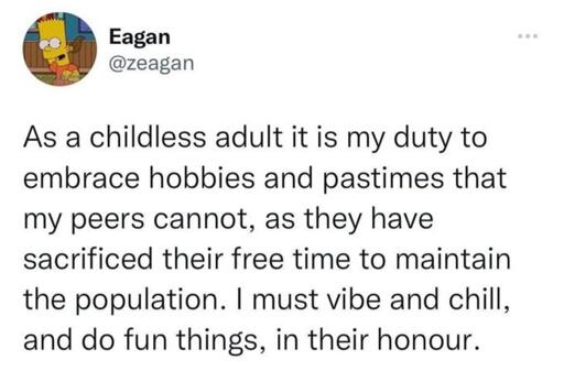 It’s not that they will necessarily regret not having kids. But if they don’t attempt to get involved in community and culture in any way, they will be left behind at some point. Then they can brag about hobbies and vacations and sex and sleep, but it’s gonna fucking hit them like a ton of bricks one day when they realize that society moved on without them and that they no longer know how to speak the language of their peers because they will miss ALL the references and the cultural and community context that was built when they were busy jetskiing in Hawaii.