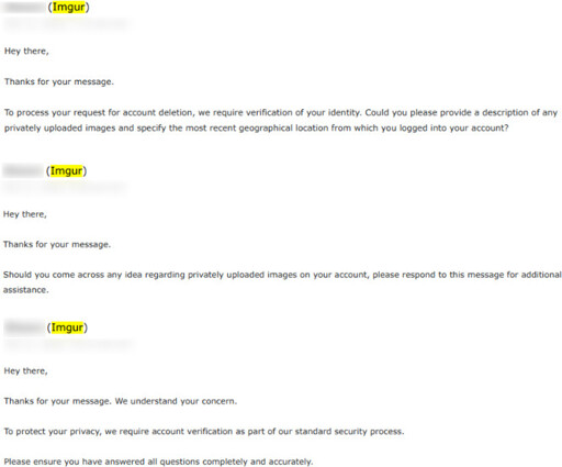I made a real effort to answer, giving my best guesses for both, but their responses were consistently passive-aggressive, as if I was the one being unreasonable! And all that friction just for them to delete my email address and a couple of images that I may or may not have uploaded to Imgur over the last 10 years.