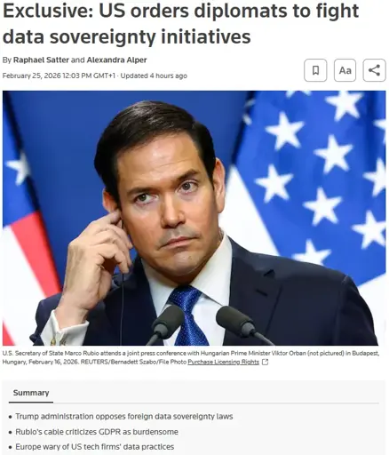 cross-posted from: https://lemmy.world/post/43567702 Source: https://www.reuters.com/sustainability/boards-policy-regulation/us-orders-diplomats-fight-data-sovereignty-initiatives-2026-02-25/