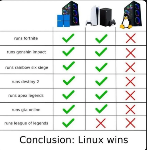 Yeah this is only a win if you don’t play those games. Unfortunately these games are intensely popular and the lack of compatibility stunts the popularity of Linux. I expect there is a similar anti-meme of this list titled “why I’ll never install Linux”