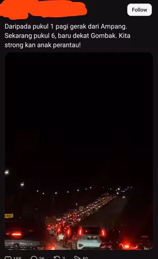 Translation: since 1am we start driving from Ampang. Now 6am, we only reached Gombak. We’re staying strong!