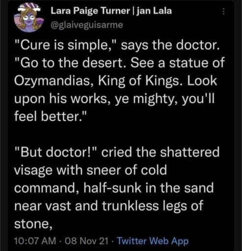 It’s a mashup between an old joke about a depressed clown and the poem Ozymandias by Shelley