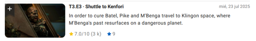 I really like this episode, not only because it continue the story of M’benga, but also because it has this tradition complexity about Kilingon, and lot of action and drama in every character.